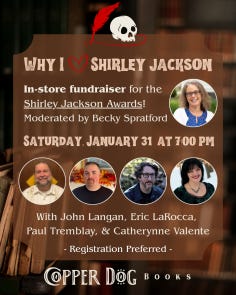 Okay, I won’t actually be attending this event (which will happen at Copper Dog Books in Beverly, MA), but since I’m the current President of the Shirley Jackson Awards Board of Directors, I figure I should promote it! Besides, it looks fantastic.