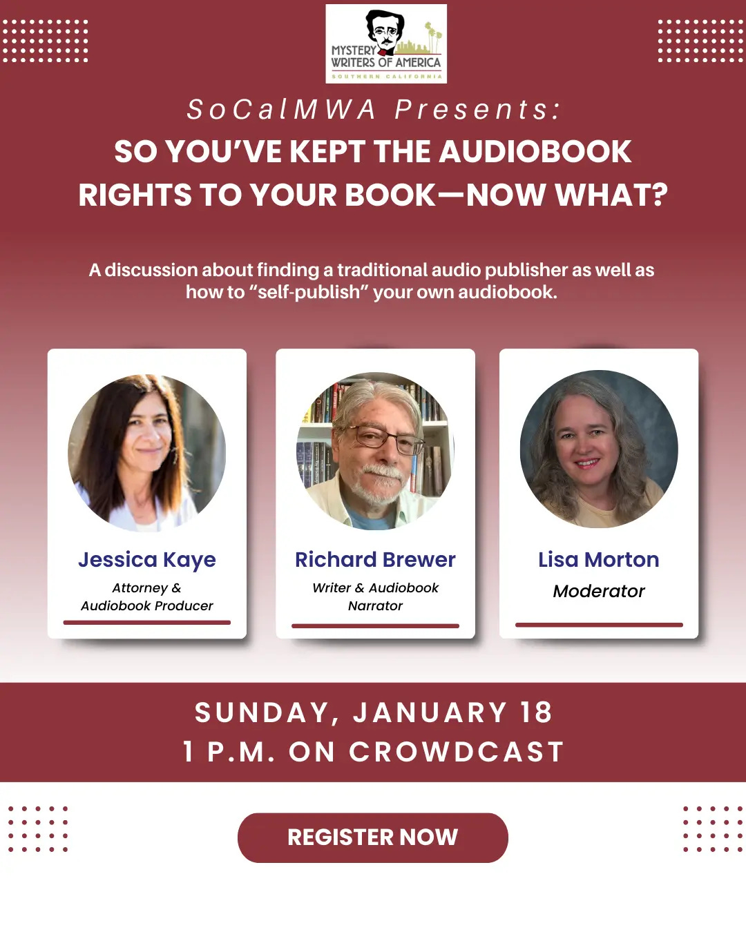 This one’s only open to MWA members, but hey, if that’s you - please join us! I’ll be talking about using Amazon’s ACX to create your own indie audiobooks, but Richard and Jessica are the real pros here and I expect to learn a lot from them!